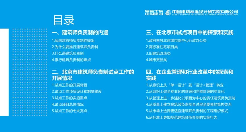 其次韓高峰總經(jīng)理展示了近年來(lái)標(biāo)準(zhǔn)院和兄弟院承接的12個(gè)建筑師負(fù)責(zé)制試點(diǎn)項(xiàng)目,分享了項(xiàng)目實(shí)施中的寶貴經(jīng)驗(yàn),并總結(jié)了北京市建筑師負(fù)責(zé)制推行中的工作重點(diǎn)和工作亮點(diǎn)。